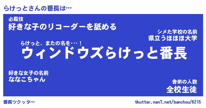 | 意味不明あだ名 | 『ペロリンらけっと』『永久保存らけっと』 |