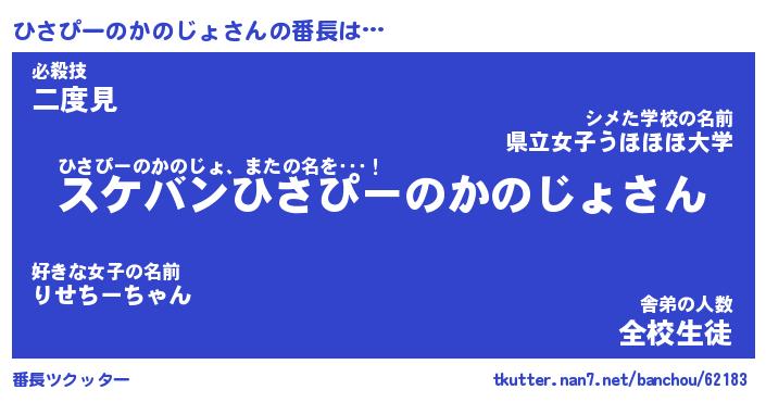 | 伝説のあだ名 | 『不死鳥のスナイパーひさぴーのかのじょ』 |
