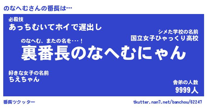 | 2回繰り返すあだ名 | 『のなのな』『ののなな』『ごーごー』 |