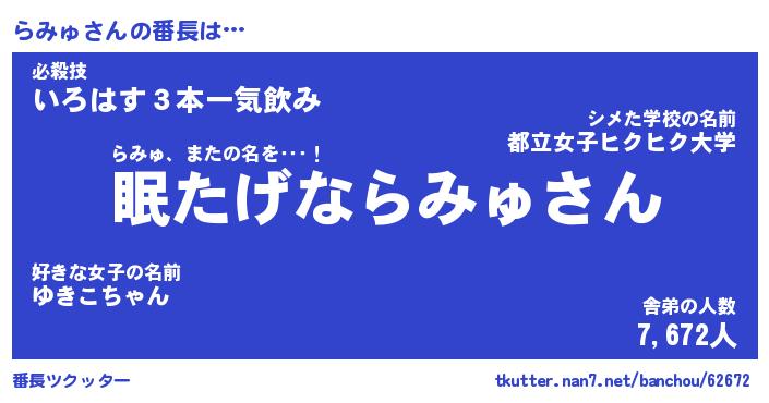 | 肩書あだ名 | 『らみゅ社長令嬢』『らみゅ国家主席』 |