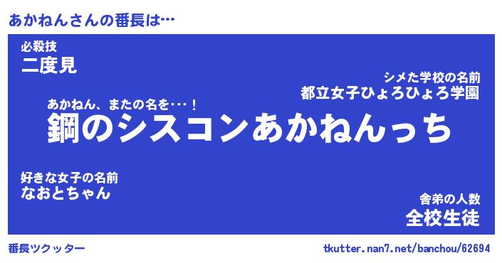 | 意味不明あだ名 | 『ペロリンあかねん』『永久保存あかねん』 |