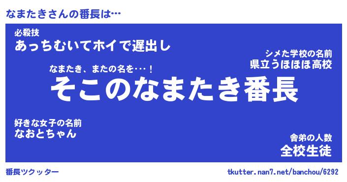 | ヒーロー風カッコイイあだ名 | 『スーパーナマタキ』『天弓騎士ナマ』 |