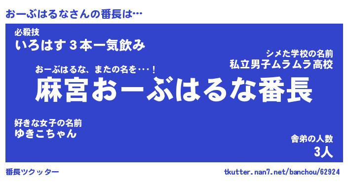 | 肩書あだ名 | 『おーぶはるなCEO』『おーぶはるな塾長』 |