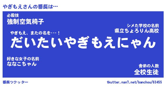 | 意味不明あだ名 | 『ペロリンやぎもえ』『永久保存やぎもえ』 |