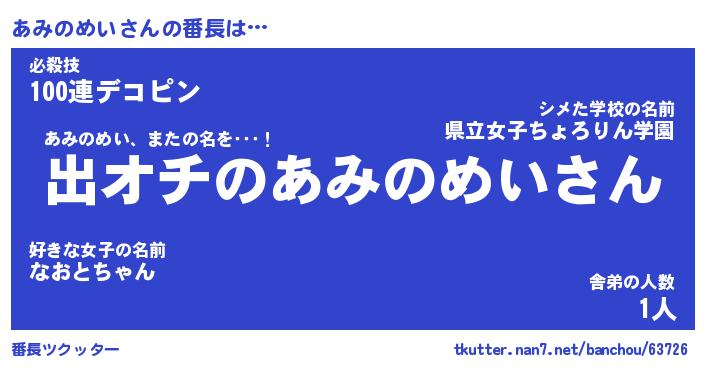 | 肩書あだ名 | 『あみのめい社長令嬢』『あみのめい班長』 |