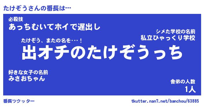 | 意味不明あだ名 | 『ペロリンたけぞう』『永久保存たけぞう』 |