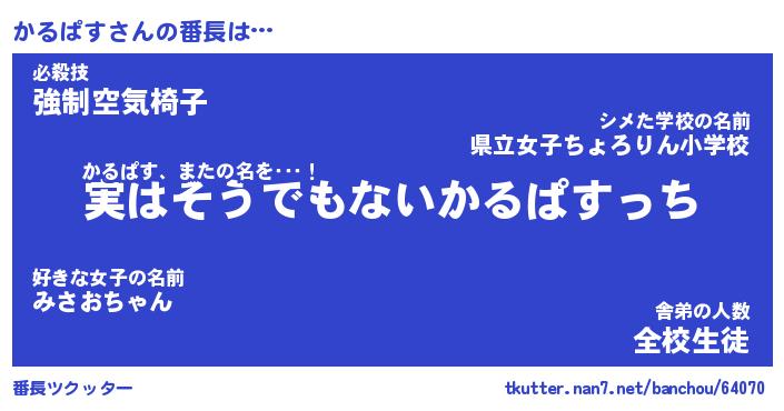 | 意味不明あだ名 | 『ペロリンかるぱす』『永久保存かるぱす』 |