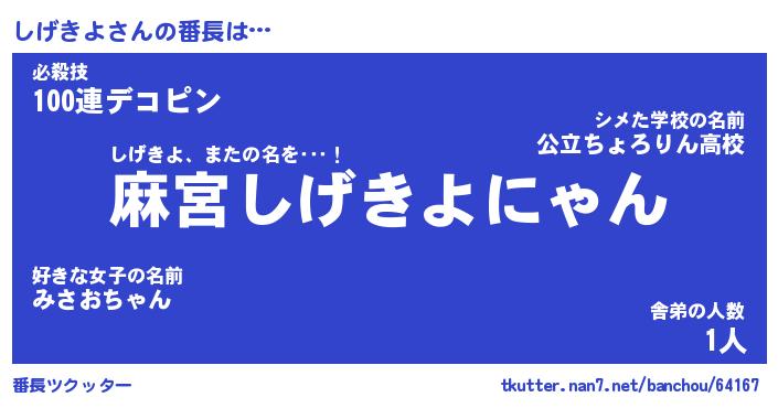 | 意味不明あだ名 | 『ペロリンしげきよ』『永久保存しげきよ』 |