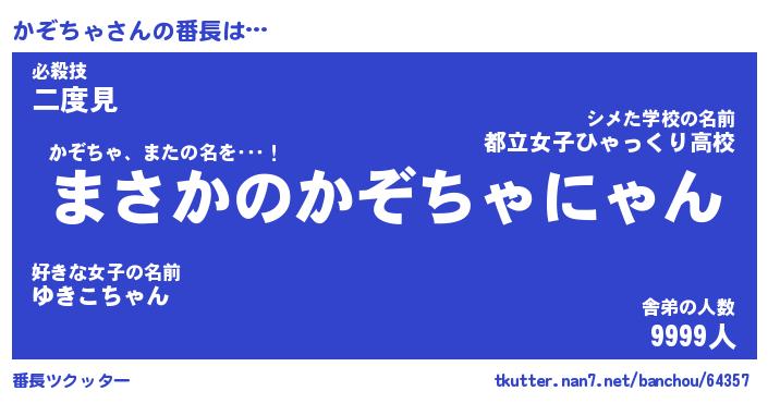 | ヒーロー風カッコイイあだ名 | 『スーパーカゾチャ』『天弓騎士カゾ』 |