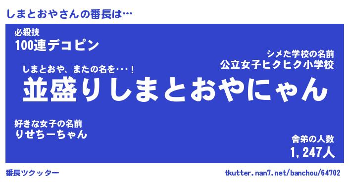 | 男性向けラノベタイトル風あだ名 | 『しまとおやの憂鬱』 |