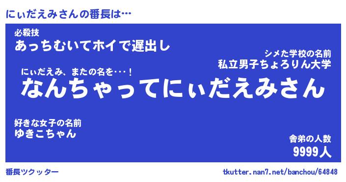 | 男性向けラノベタイトル風あだ名 | 『にぃだえみの憂鬱』 |