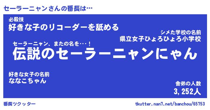 | 伝説のあだ名 | 『伝説のスナイパーセーラーニャン』 |