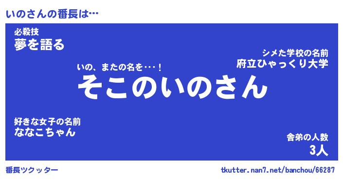| ピコ太郎風あだ名 | 『イコ史郎』『ピイ六郎』『イノ五郎』 |