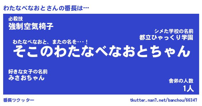 | 男性向けラノベタイトル風あだ名 | 『わたなべなおとの憂鬱』 |