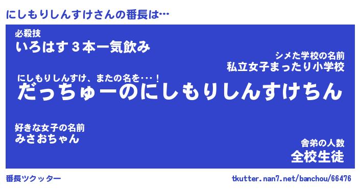 | 男性向けラノベタイトル風あだ名 | 『にしもりしんすけの憂鬱』 |
