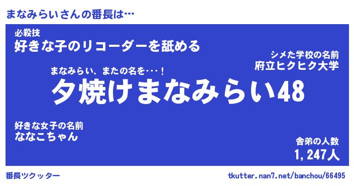 | 肩書あだ名 | 『まなみらい店長』『まなみらい国家主席』 |