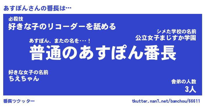 | 意味不明あだ名 | 『ペロリンあすぽん』『永久保存あすぽん』 |