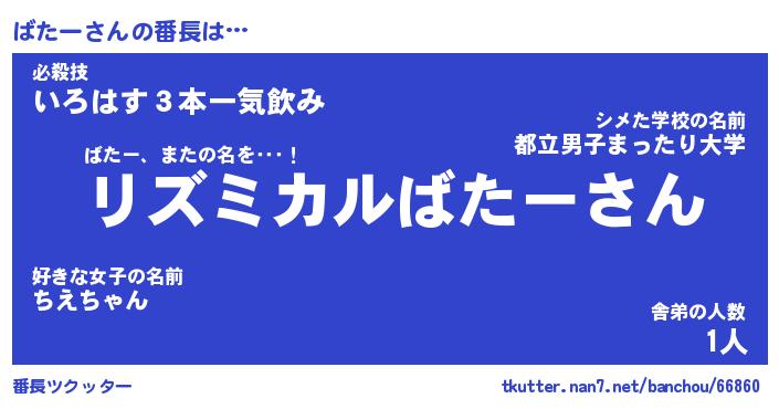 | 肩書あだ名 | 『ばたー社長令嬢』『ばたー大統領』 |