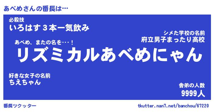 | ヒーロー風カッコイイあだ名 | 『スーパーアベメ』『ウルトラあべめマン』 |