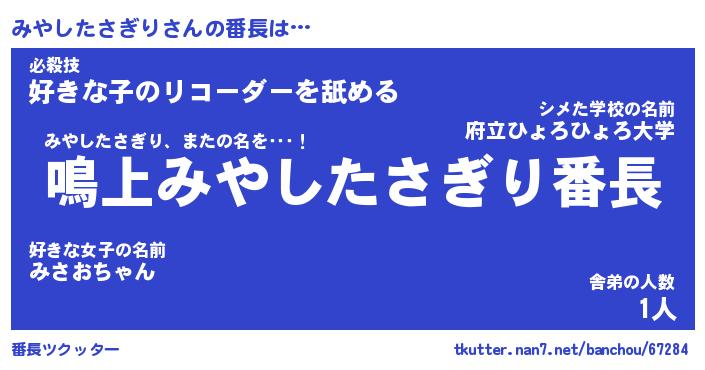 | 肩書あだ名 | 『みやしたさぎり御曹司』 |