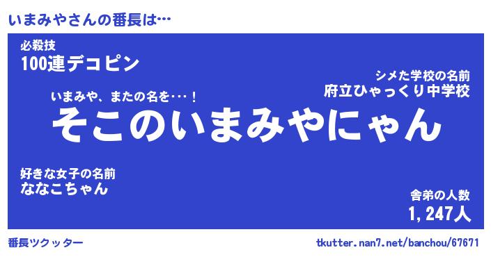 | 意味不明あだ名 | 『ペロリンいまみや』『永久保存いまみや』 |