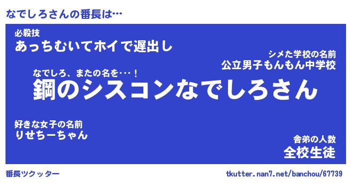 | 意味不明あだ名 | 『ペロリンなでしろ』『永久保存なでしろ』 |