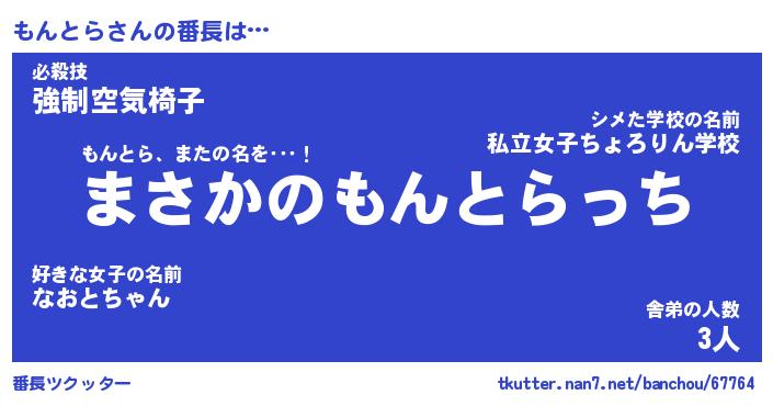 | 意味不明あだ名 | 『ペロリンもんとら』『永久保存もんとら』 |