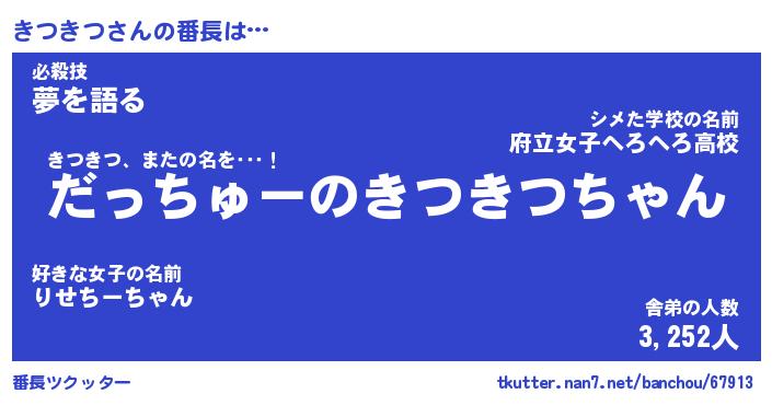 | 意味不明あだ名 | 『ペロリンきつきつ』『永久保存きつきつ』 |