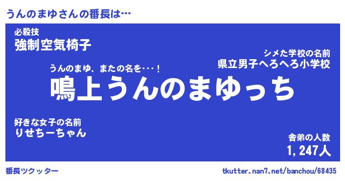 | ヒーロー風カッコイイあだ名 | 『スーパーウンノマユ』『銀牙騎士ウン』 |