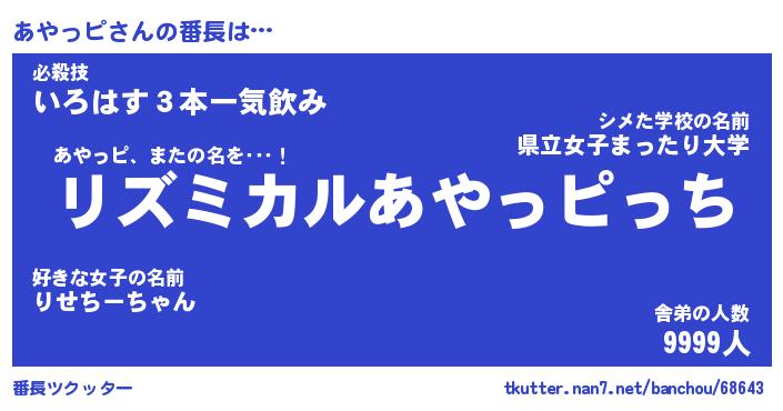 | 意味不明あだ名 | 『ペロリンあやっピ』『永久保存あやっピ』 |