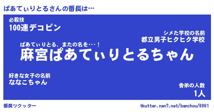 | 伝説のあだ名 | 『不死鳥のスナイパーぱあてぃりとる』 |