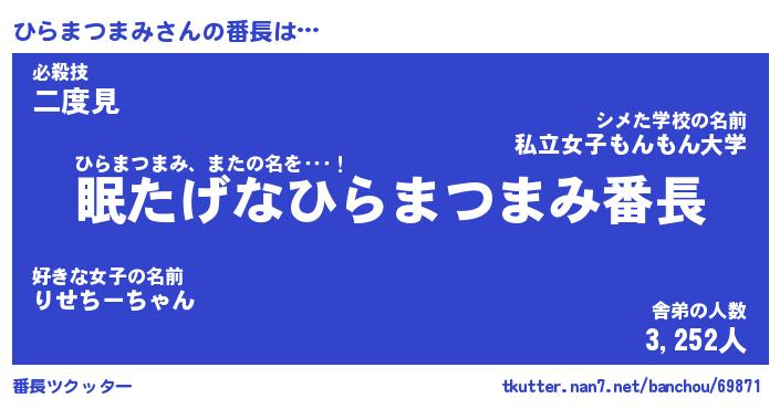 | ヒーロー風カッコイイあだ名 | 『スーパーヒラマツマミ』『幻影騎士ヒラ』 |
