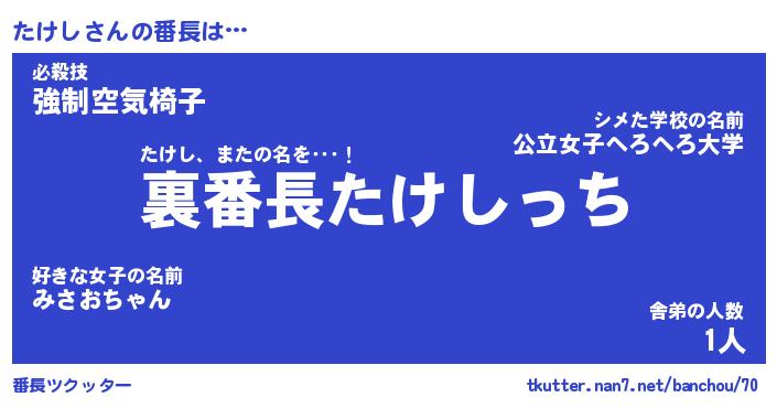 | ファンタジー風あだ名 | 『タケフェル』『エターナルタケシー』 |