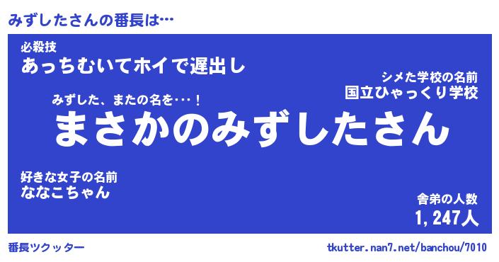 | ピコ太郎風あだ名 | 『ミコ五郎』『ピミ史郎』『ミズ六郎』 |