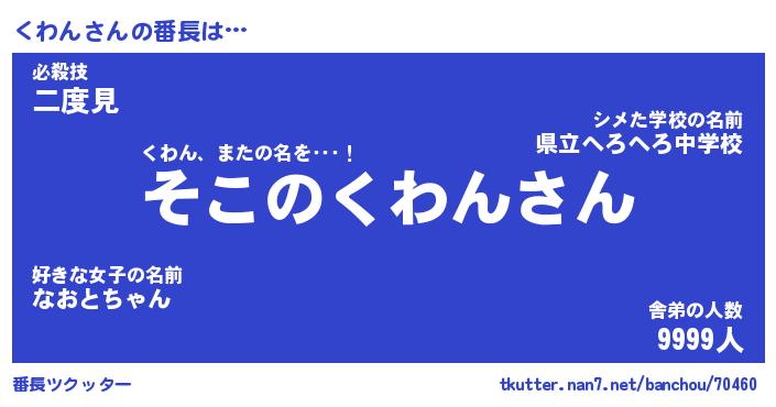 | ヒーロー風カッコイイあだ名 | 『スーパークワン』『ウルトラくわんマン』 |
