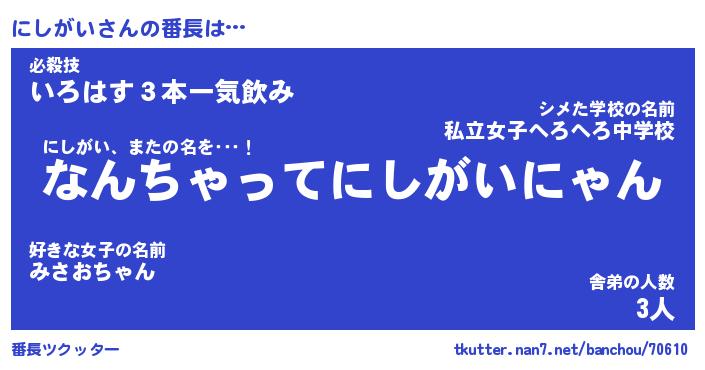 | ヘコむあだ名 | 『にしもー』『なまこ酢』『にしっ子』 |