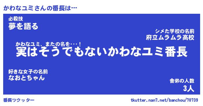 | ヒーロー風カッコイイあだ名 | 『スーパーカワナユミ』『魔戒騎士カワ』 |