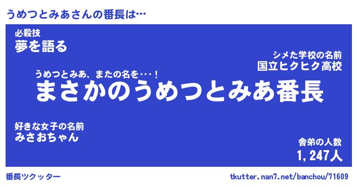 | 男性向けラノベタイトル風あだ名 | 『うめつとみあの憂鬱』 |