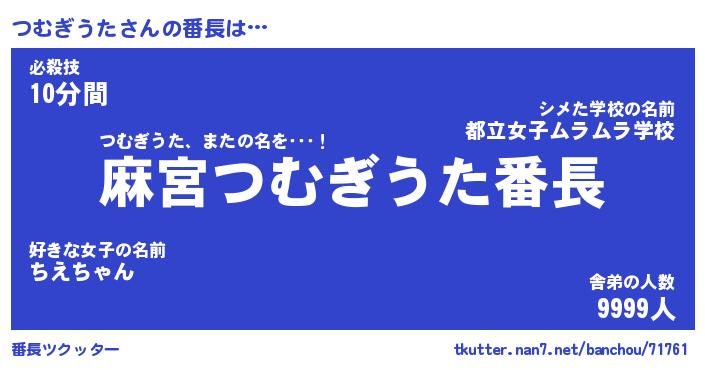 | 伝説のあだ名 | 『不死鳥のスナイパーつむぎうた』 |