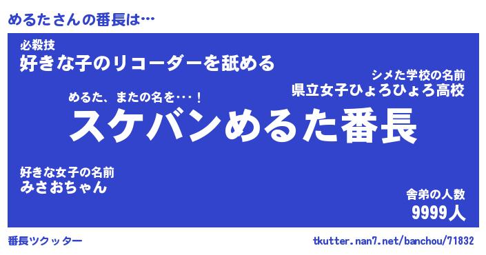 | 肩書あだ名 | 『めるた店長』『めるた総理大臣』 |