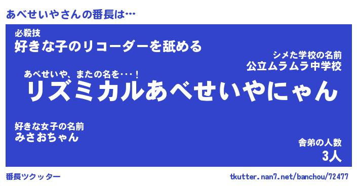 | 肩書あだ名 | 『あべせいや店長』『あべせいや総理大臣』 |