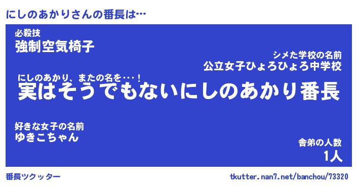 | ヒーロー風カッコイイあだ名 | 『スーパーニシノアカリ』『黄金騎士ニシ』 |