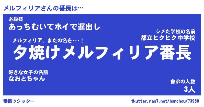 | ヒーロー風カッコイイあだ名 | 『スーパーメルフィリア』『魔戒騎士メル』 |