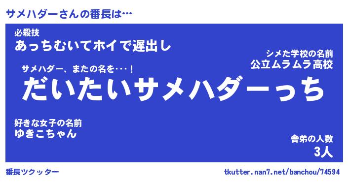 | 男性向けラノベタイトル風あだ名 | 『サメハダーの憂鬱』 |