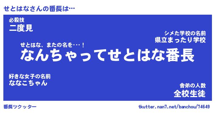 | 意味不明あだ名 | 『ペロリンせとはな』『永久保存せとはな』 |