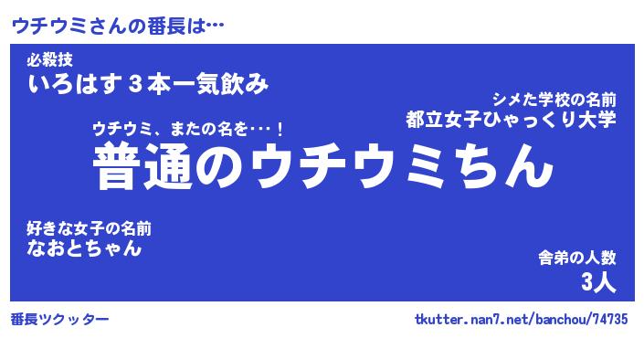 | 肩書あだ名 | 『ウチウミ社長』『ウチウミ総理大臣』 |