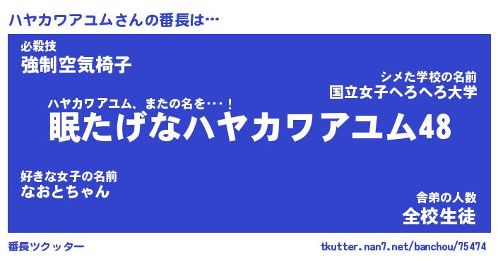 | 伝説のあだ名 | 『封印されしスナイパーハヤカワアユム』 |