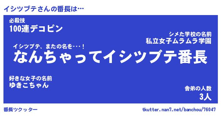 | ヒーロー風カッコイイあだ名 | 『スーパーイシツブテ』『魔戒騎士イシ』 |