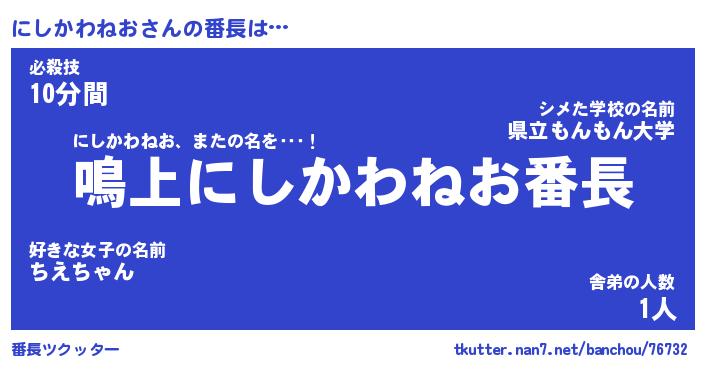 | 恥ずかしいあだ名 | 『プリティーにしかわねお』『にしっちょ』 |