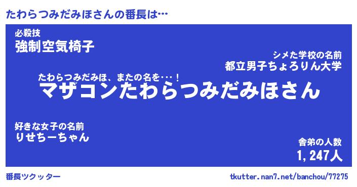 | 肩書あだ名 | 『たわらつみだみほ御曹司』 |